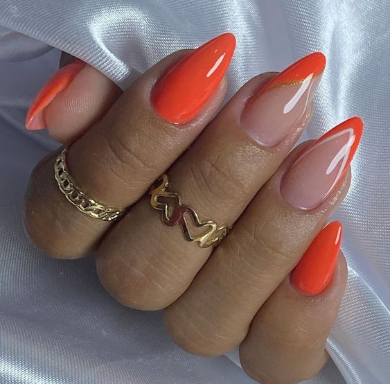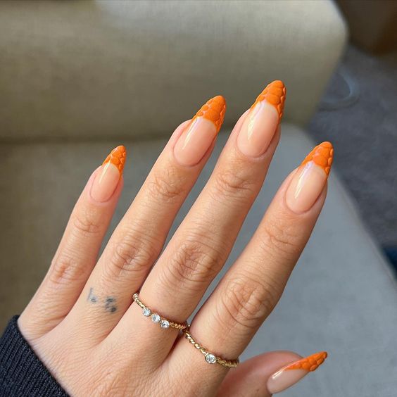 This nail design features a subtle nude base with elegant pumpkin-colored outlines at the tips. The precision of the lines adds a minimalist yet chic look, perfect for those who prefer sophisticated, understated nail art. This style is versatile enough for both professional environments and casual outings.