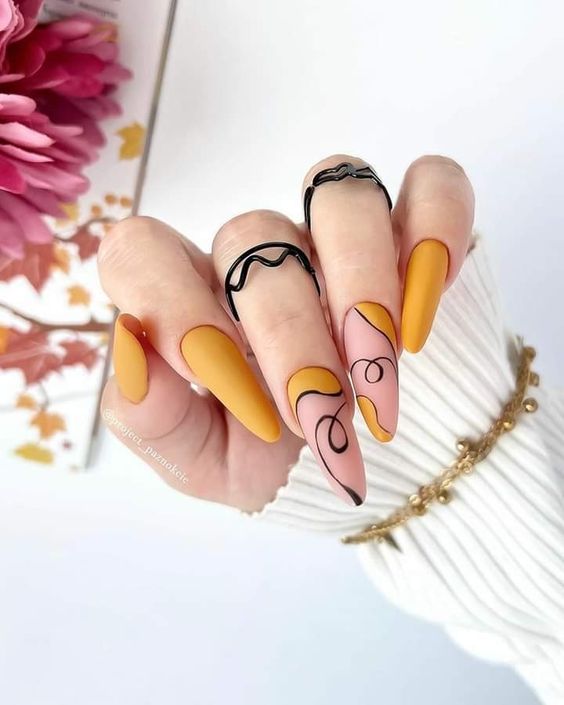 This nail design combines soft blush hues with vibrant pumpkin orange, accented by artistic black line work that gives it a modern edge. The smooth transition between colors mimics the gentle fall of autumn leaves, making it a perfect choice for both everyday wear and special occasions. The almond shape of the nails adds a touch of elegance, while the matte finish provides a contemporary look.