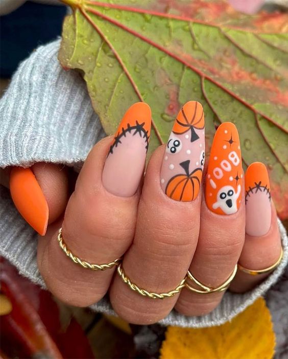 Capturing the playful side of fall, this design showcases nails painted in alternating shades of matte and glossy finishes, with charming illustrations of pumpkins and ghosts. It’s a perfect mix of seasonal cheer and stylish flair, great for those who love to celebrate the whimsy of Halloween and fall.