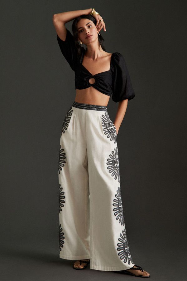 These cream wide pants with black floral accents offer a monochromatic charm. The contrasting black crop top complements the pants’ pattern, making for a harmonious and stylish ensemble. This look is perfect for those who appreciate subtle details without sacrificing comfort.