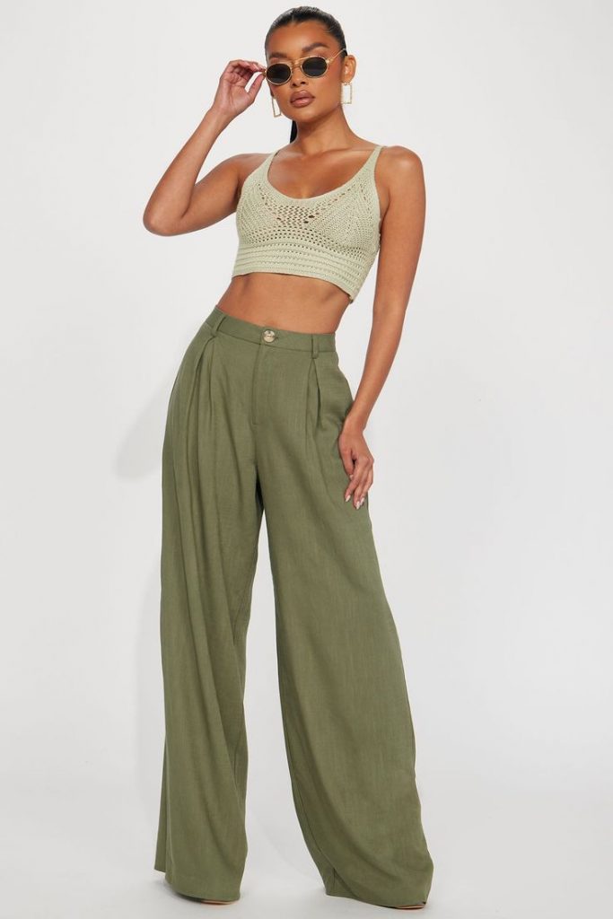These olive green wide pants meld comfort with contemporary style. Teamed with a crochet crop top, this outfit is both trendy and tranquil, ideal for a relaxed day in the city or a peaceful retreat to the countryside. The neutral tones keep the look grounded, allowing for versatile styling options.