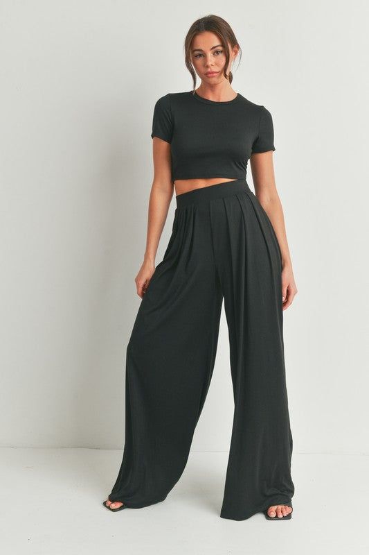 This outfit seamlessly blends simplicity and style with its black wide pants paired with a cropped V-neck top. The ensemble is ideal for an evening out or a casual day, depending on how it is accessorized. The flowy nature of the pants adds a touch of grace, while the cropped top keeps it youthful and fresh. Pair these with minimalist accessories and stiletto heels for a refined look.