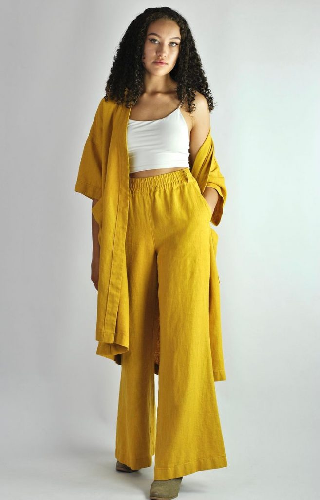The bold mustard wide pants paired with a white crop top and matching long coat make for a stunning visual statement. This color combination is daring yet incredibly stylish, making it a perfect ensemble for those looking to stand out. The outfit is accessorized minimally to keep the focus on the pants.