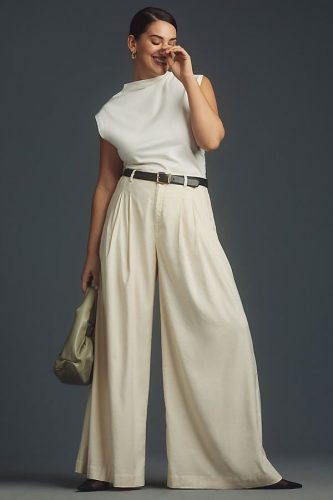 Cream-colored wide pants paired with a subtle, elegant top make this outfit a prime choice for business or casual settings. The simplicity of the color palette lends a sophisticated air, perfect for a minimalist aesthetic. Adding a belt can accentuate the waist and add structure to the overall look.