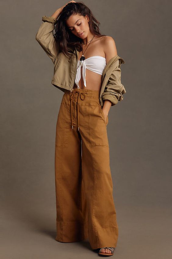 These beige wide pants are distinctly bohemian, adorned with ruffles that add volume and a playful edge. Paired with a simple, tight-fitting tank top, this outfit strikes a balance between laid-back and chic. Ideal for a beach day or a casual meet-up, the pants’ earth tones pair well with leather sandals and a wide-brimmed hat.