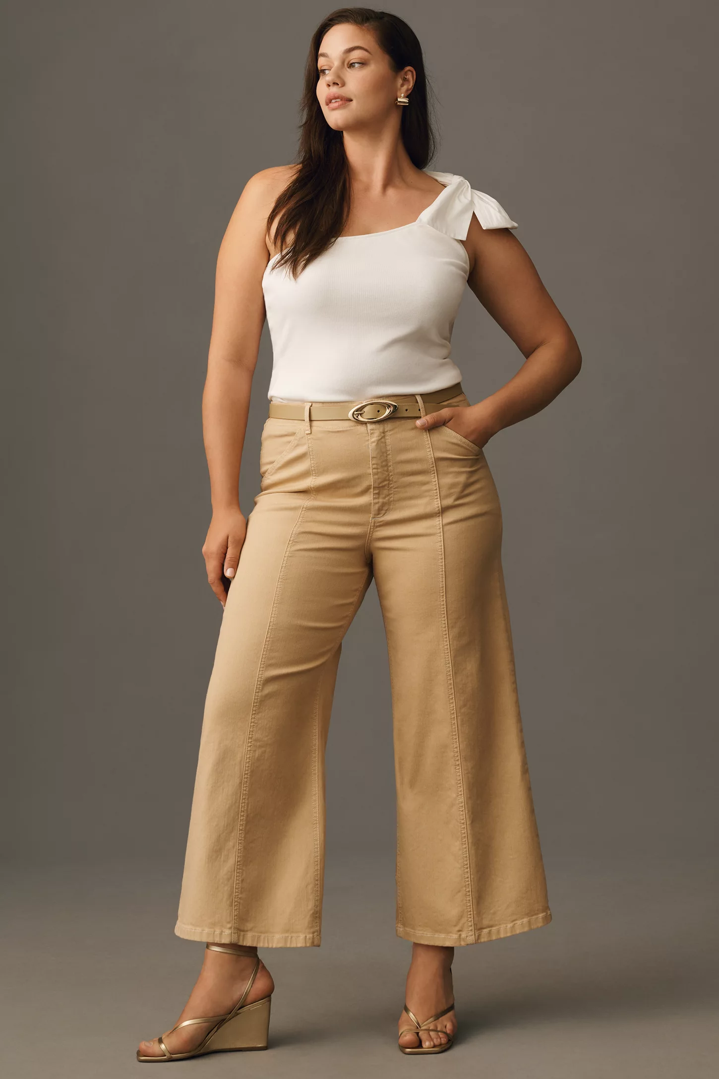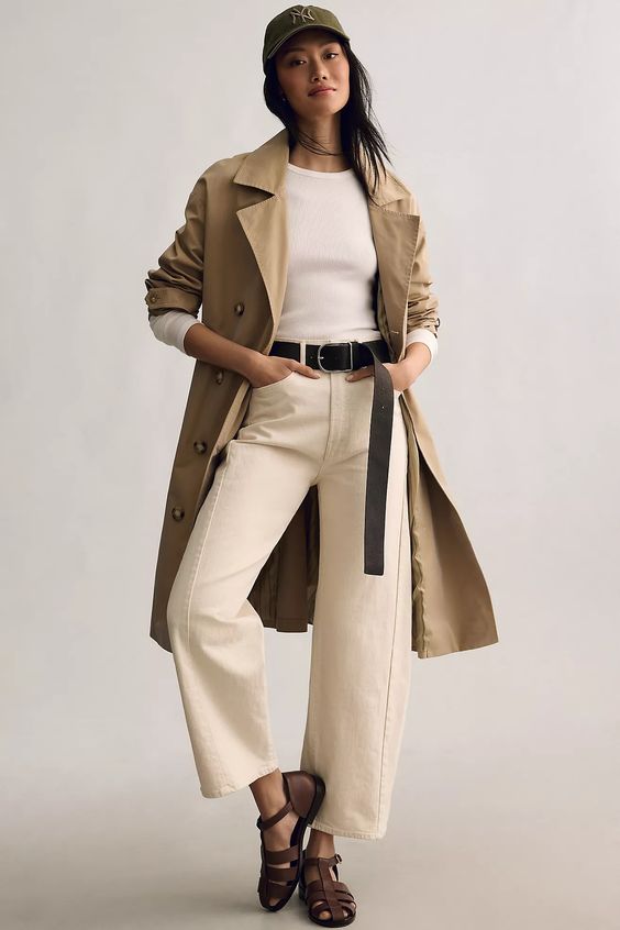 Starting strong, the timeless combination of a white one-shoulder top and wide-legged beige jeans is perfect for those seeking simplicity with a touch of elegance. This ensemble works beautifully for a variety of settings, proving that minimalistic designs can make a significant impact. To elevate this look, consider accessories in gold or a sleek, understated handbag to maintain that clean, refined aesthetic.