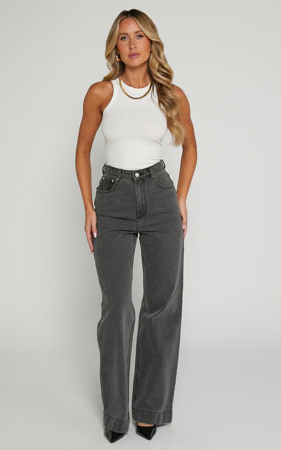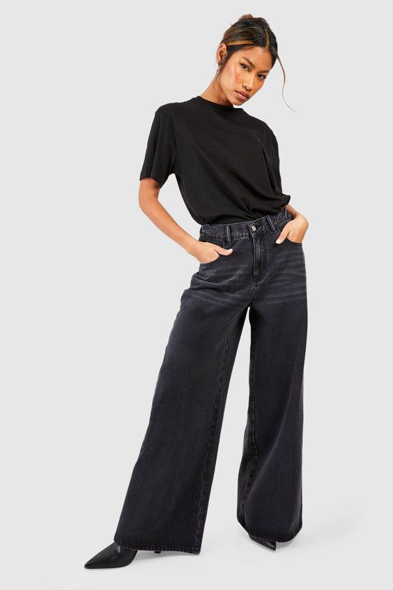 For an edgier look, consider high jeans with a distressed finish and a casual tee. This outfit idea embraces the urban, contemporary style many seek while keeping it comfortable and wearable. It’s perfect for a weekend outing, combining ideas black with practicality in a way that’s effortlessly chic.