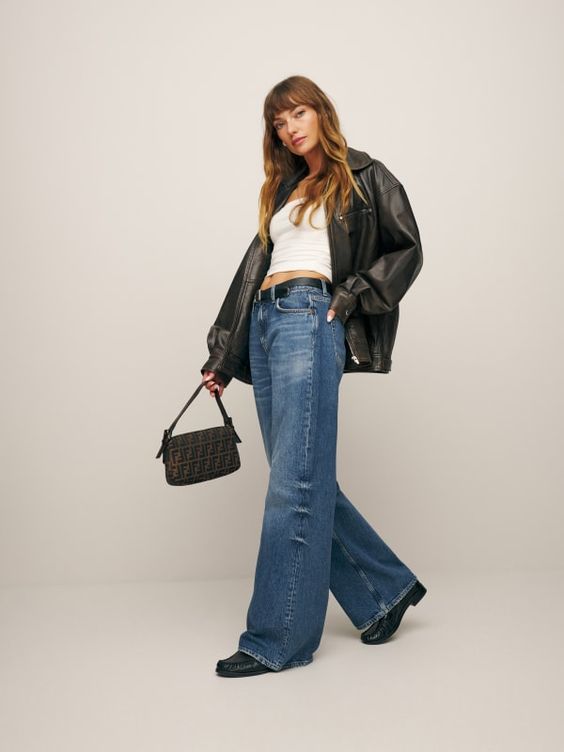 For those who lean towards a sleeker aesthetic, this outfit featuring dark high-rise jeans paired with a fitted black turtleneck offers an excellent foundation for autumn layering. Ideal for both a casual day out or a more formal setting, these jeans provide a flattering silhouette that elongates the legs, making it a must-have in every fashion-conscious woman’s closet.
