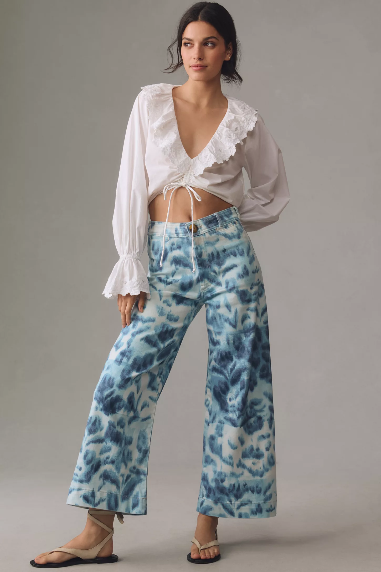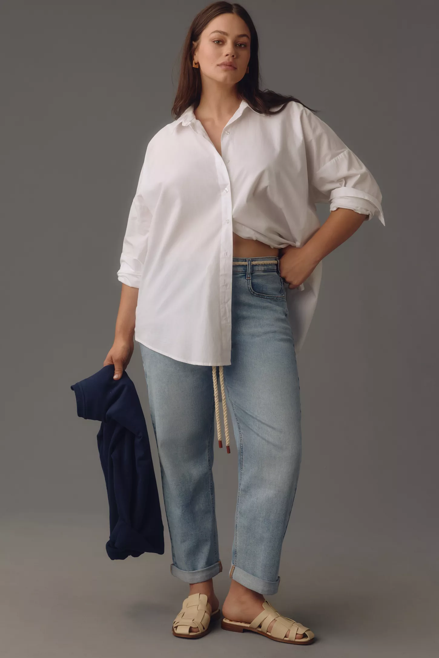 The quintessential blue high jeans paired with a crisp white blouse is a testament to timeless style and simplicity. This look is versatile and can be dressed up or down, depending on the occasion, making it a staple in any wardrobe. Opt for delicate silver jewelry and a statement watch to complete this classic ensemble.