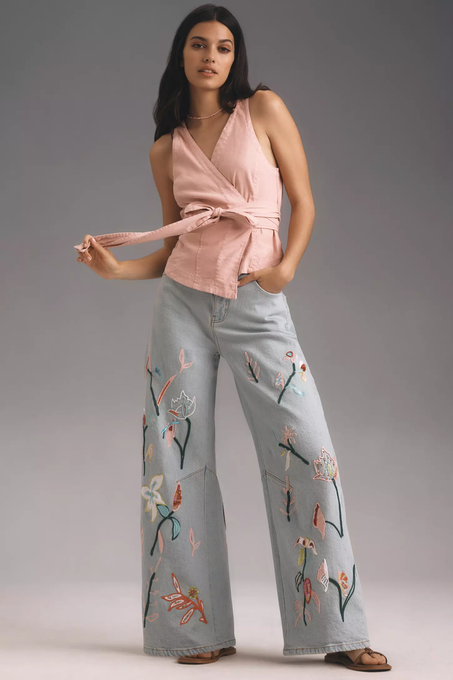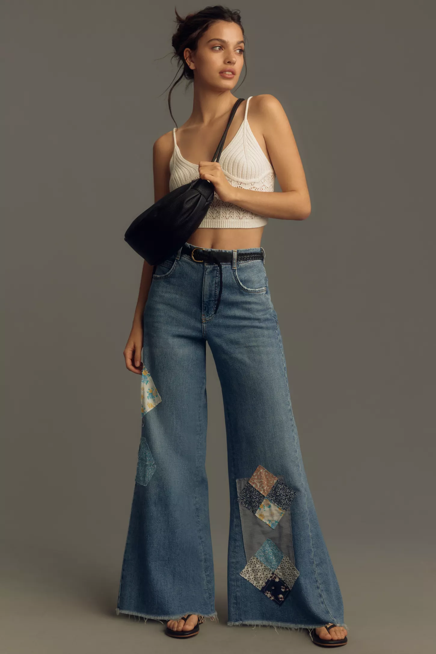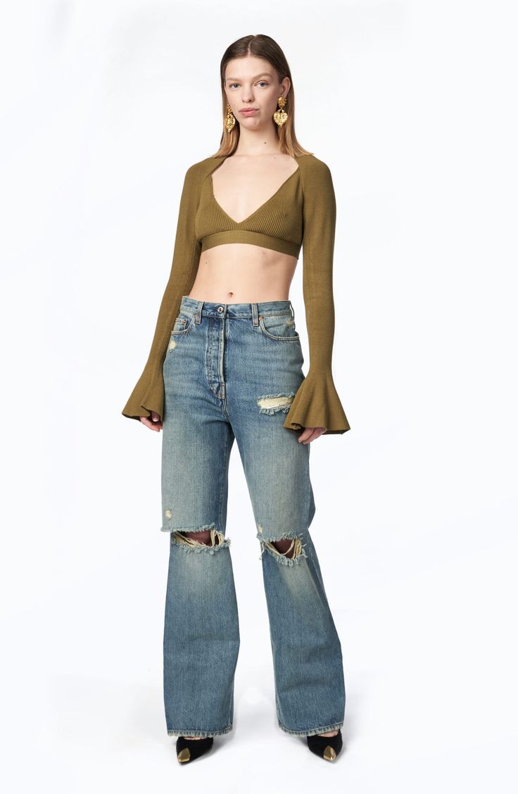 Embrace a bohemian vibe with these flared jeans adorned with intricate embroidery and a simple black crop top. This look not only captures the designs 2024 trend but also offers a playful yet sophisticated option for those looking to add a unique touch to their denim repertoire. Accessories like chunky jewelry or a fringed bag can further enhance the boho-chic feel.