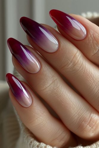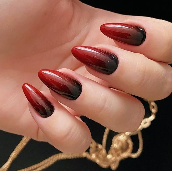 Burgundy and black blend into a perfect gradient in this sophisticated ombre nail design, reflecting the deep hues of an autumn evening. The glossy finish adds a touch of elegance, making these nails a suitable choice for both daytime business meetings and evening social events. This style uses Gel nails technology to ensure a durable and striking appearance. The pointed Almond shape further accentuates the chic and bold character of the design.