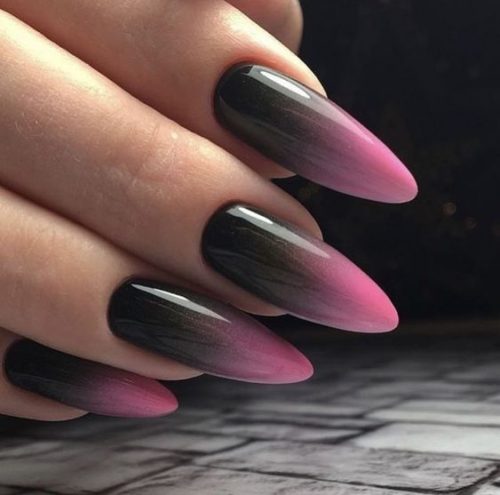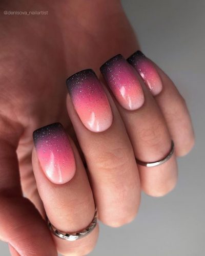 This design features a stunning transition from deep black to a soft pink, reminiscent of the twilight sky. The bold contrast not only highlights the dramatic shift in colors but also offers a modern twist to the classic ombre. Perfect for evening events, these nails add a touch of mystery and sophistication to any outfit.