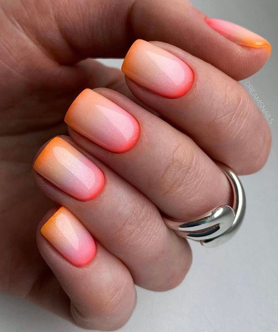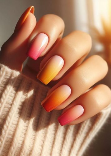 Capture the essence of an autumn sunset with this vibrant ombre nail design featuring shades of orange and pink. This look is perfect for those who prefer a brighter, more expressive nail art style. The long, Oval shape of the nails provides a generous canvas for the gradient effect, which uses Dip nails for long-lasting wear. This style is ideal for casual outings and can add a pop of color to any neutral autumn outfit.