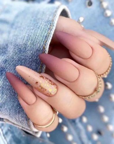 For a touch of understated luxury, this nude ombre sprinkled with gold flakes offers elegance and sophistication. It’s perfect for those who prefer minimalistic beauty but still want a hint of seasonal flair.