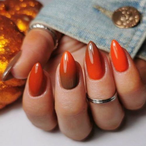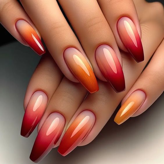 Capture the essence of a cozy autumn fire with this bold orange ombre. The vibrant orange shades blend seamlessly, creating a look that’s both eye-catching and quintessentially fall.