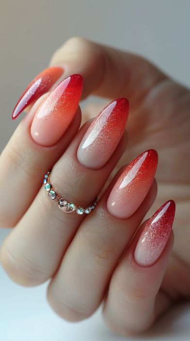 This nail design mirrors the breathtaking colors of an early autumn sunrise. It starts with a soft pink at the base and melts into a fiery orange at the tips, sprinkled with a touch of glitter for a dewy morning effect. The Almond shape enhances the feminine grace of the gradient, making it a perfect choice for both day and evening wear.