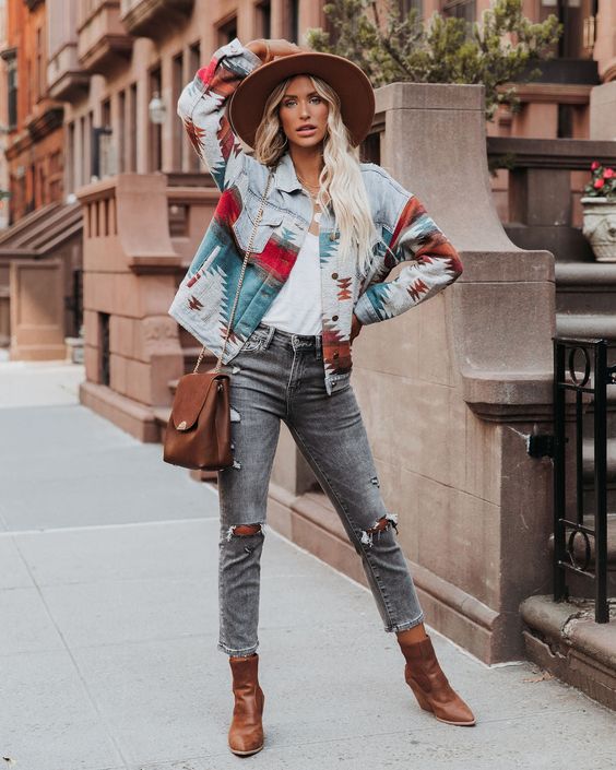 Embrace the bohemian rhapsody with a denim jacket and skirt outfit for fall that features eclectic patterns and a laid-back silhouette. This outfit blends rustic charm with urban sophistication, showcasing a patchwork denim jacket paired with rugged jeans and a wide-brimmed hat. The ensemble is perfect for a casual stroll through the city or a relaxed weekend outing. The earthy tones and mixed patterns encapsulate a free-spirited aesthetic that is both comfortable and eye-catching.