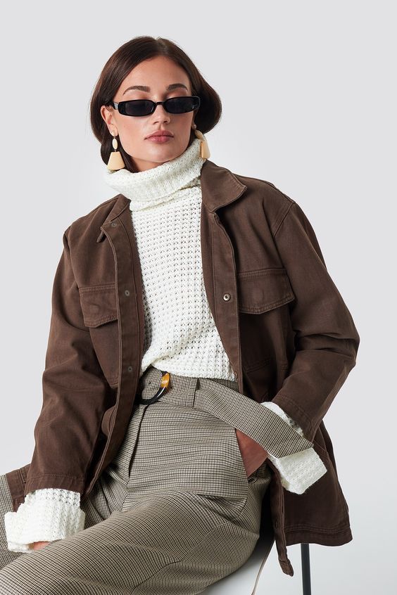 This outfit offers a structured yet stylish look, showcasing a rich brown jacket layered over a textured white sweater. For those who prefer a more constructed outfit, this setup is perfect for fall, combining warmth and fashion-forward detailing. The blend of earthy tones and structured design adds a touch of sophistication, making it ideal for professional settings or chic social gatherings.