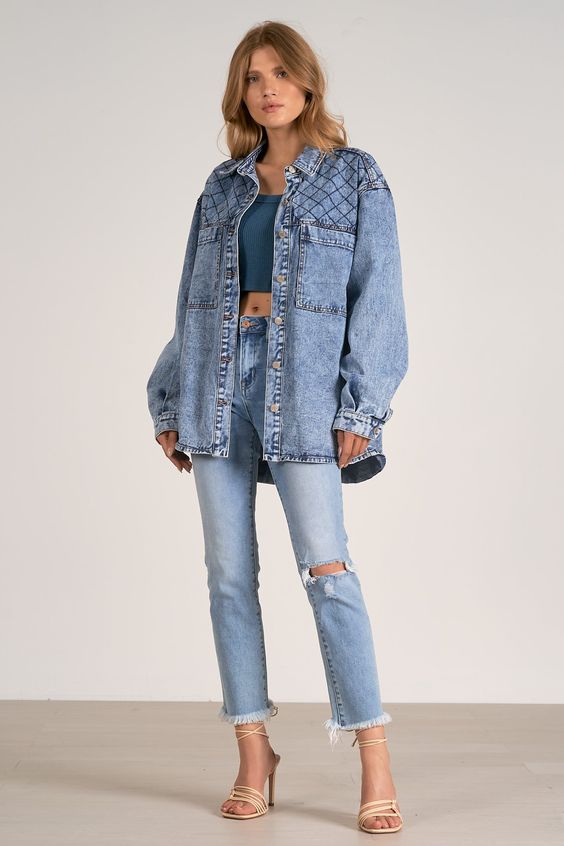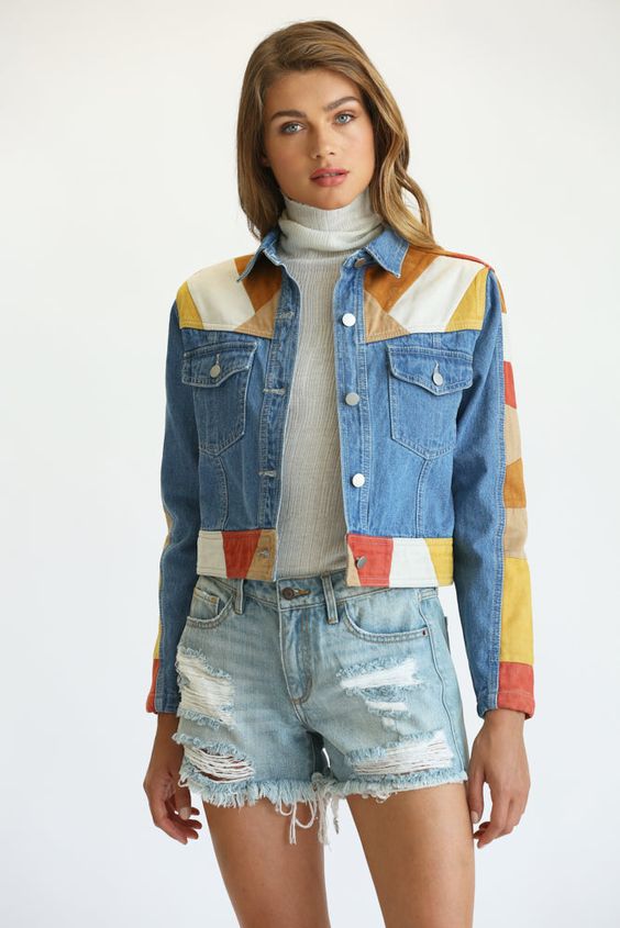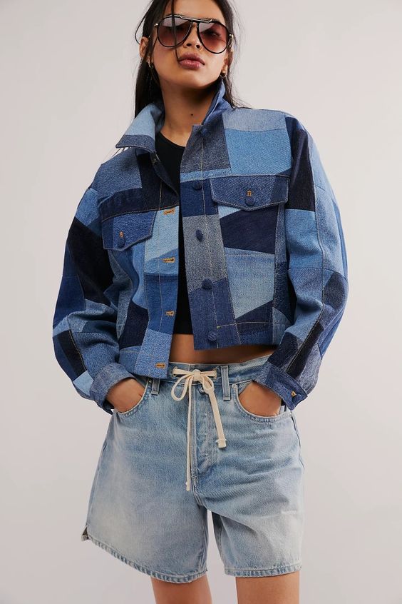 This patchwork denim jacket combines various shades of blue, offering an artistic and eclectic appeal. It’s an excellent choice for those looking to incorporate unique outfit ideas into their wardrobe, showcasing creativity and a keen eye for fashion. Paired with simple jeans or shorts, it stands out as a focal piece.
