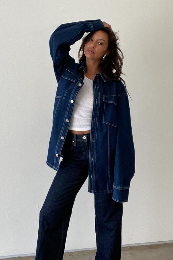 Showcasing a trendy oversized look, this denim ensemble is perfect for those who favor comfort without sacrificing style. The large pockets and detailed stitching elevate the typical denim jacket into a statement piece that’s both functional and fashionable.