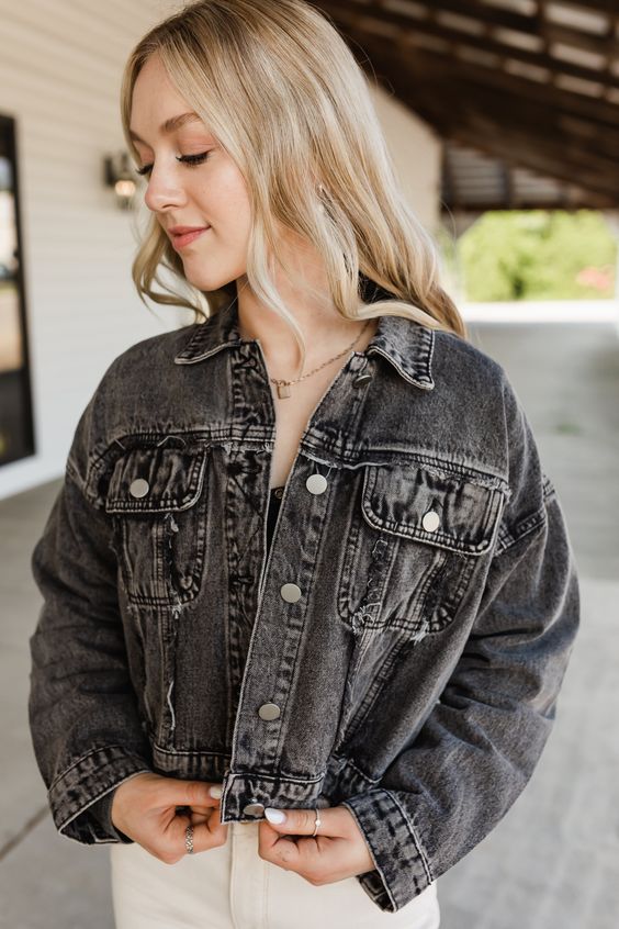 Fuse past and present with a distressed grey denim jacket that speaks volumes about vintage charm with a modern twist. Paired with off-white pants, this outfit balances old-school cool with contemporary chic. It’s perfect for those who appreciate a hint of edge in their everyday wear. The washed-out grey and distressed details add character, making each piece a conversation starter.