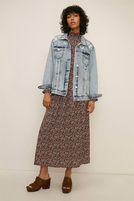 Return to the roots with a classic blue denim jacket styled over a delicate patterned dress. This look combines timeless elements with modern cuts, ideal for a seamless transition through various fall activities. Whether you’re heading to a meeting or meeting friends for lunch, this outfit maintains a balance between casual and refined, making it a versatile addition to your wardrobe.