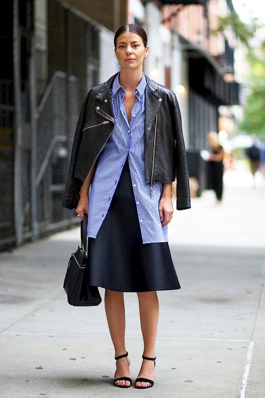 For those who edge towards a modern, bold look, a black leather jacket paired with a blue-striped midi dress provides a striking contrast. This outfit is perfect for transitional weather, balancing the lightness of the dress with the ruggedness of the jacket. Accessorize with black strappy sandals and a sleek black handbag for a look that’s effortlessly chic and very New York.