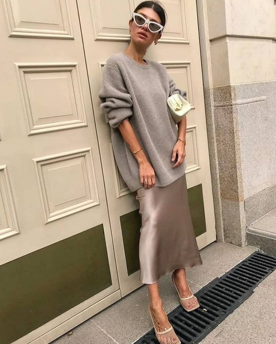 Soft and understated, this ensemble features a pale grey oversized sweater atop a silky taupe midi skirt. This pairing is perfect for those who prefer their fall fashion with a whisper rather than a shout. The midi length is versatile and flattering, ideal for both office environments and weekend outings. Pair with nude pumps and a structured handbag for a polished finish.