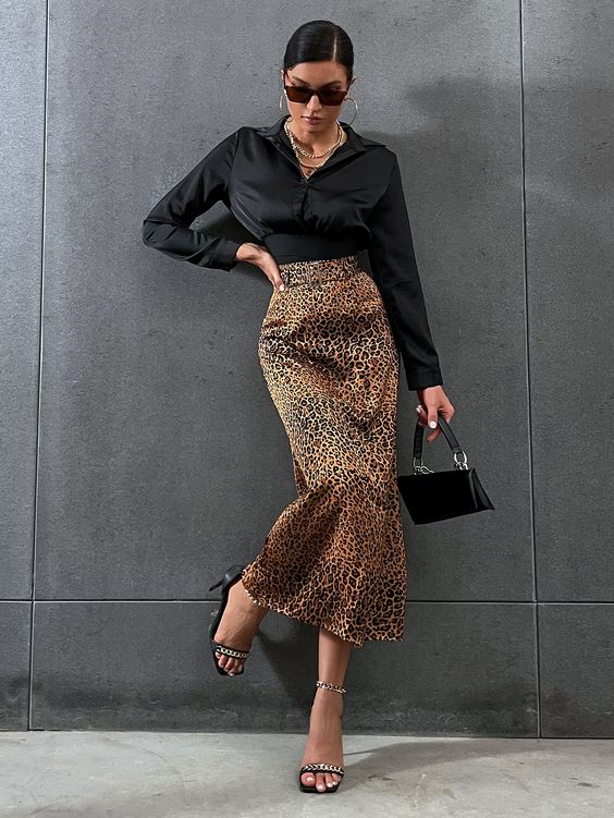 Make a bold statement this fall with a leopard print silk midi skirt combined with a simple black blouse. This look is daring yet sophisticated, perfect for those who want to stand out in a crowd. The flowy skirt adds movement and a wild flair, suitable for a night out or a creative workplace. Complete this look with black heeled sandals and a minimalist clutch.