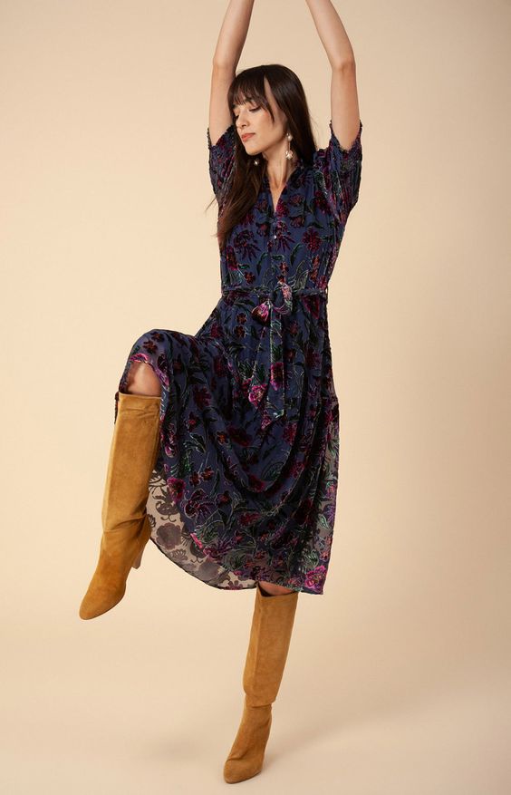 Step back in time with a floral silk midi dress that combines vintage charm with modern trends. The deep blue and rich pink hues are quintessentially fall, providing a versatile base for layering with jackets or scarves. This look is ideal for daytime events or casual office wear. Enhance it with knee-high suede boots to emphasize the retro vibe.