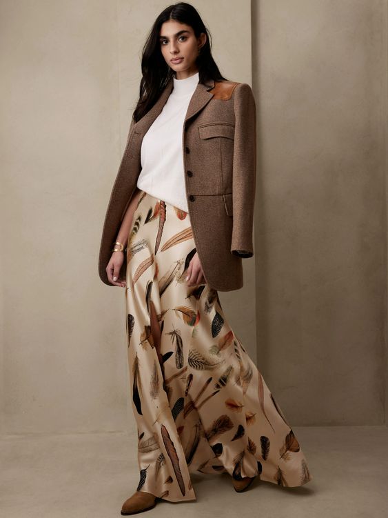 Showcase bohemian luxury with a patterned silk maxi dress. The detailed print and delicate fabric provide a soft, feminine vibe, while the floor-length cut and light fabric make it a perfect choice for fall’s transitional weather. This dress is ideal for a fall wedding or a sophisticated brunch. Pair it with strappy sandals and a simple clutch for a complete ensemble.