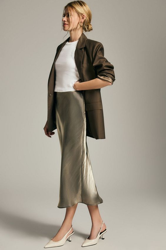 This outfit featuring a brown satin maxi skirt exudes rustic elegance. The earthy tone and silky texture make it a standout piece for fall. It’s exceptionally versatile, easily dressed up with a chic blouse or down with a casual sweater. Pair with ankle boots and a leather bag for a finished look that’s both polished and practical.