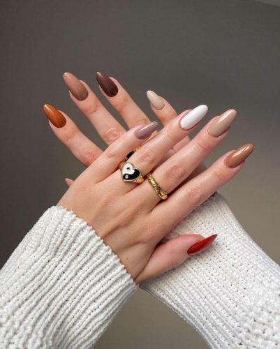 Embrace the essence of fall with nails painted in deep earth tones—rust, brown, and dusty beige, complemented by an occasional spark of brilliant white. Opt for an almond shape to enhance the sophistication of the matte finish. This design is not just a style statement but a warm reflection of autumn’s own palette, making it an ideal choice for a cozy coffee date or a brisk walk through the park.