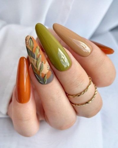 Opt for understated elegance with muted greens and yellows that mirror the quiet decay of nature. These multicolor fall nails ideas are all about appreciating the subtle beauty of the season, ideal for introspective moments or a tranquil retreat into your favorite novel.