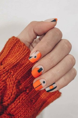 Dive into the boldness of fall with a geometric nail design in vibrant orange, black, and grey. This striking look brings a modern twist to fall gel nails multicolor, making it perfect for the fashion-forward woman. The sharp lines and almond shape exude confidence, ideally suited for a powerful office outfit or an evening event.