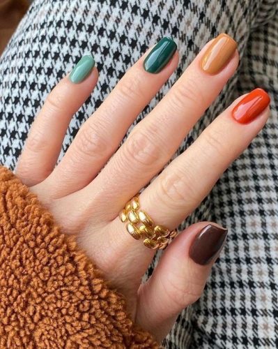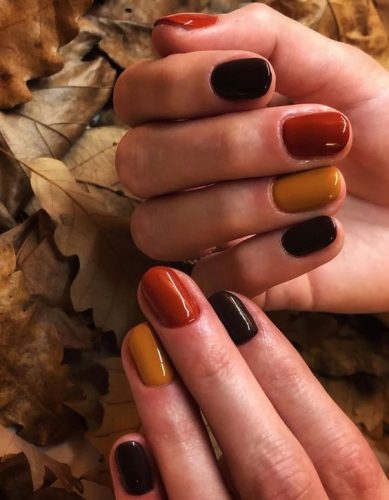 Embrace a harmonious blend of fall colors with this polished array in forest green, caramel, and fiery red. These short nails are a nod to simple fall nails multicolor, offering a sophisticated but playful palette that can transition from daywear to evening elegance with ease. They complement a woolen blazer or a chunky scarf, perfect for a weekend getaway.
