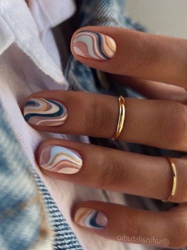 Indulge in the whimsy of soft waves with this pastel nail art, blending shades of coral, mint, and sand. The gentle curves and muted colors suggest a soft, dreamy quality, ideal for daydreamers and creatives. These nails are a perfect match for light cashmere sweaters and delicate gold rings, setting a tone of gentle femininity.