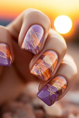 These lavender nails with golden leaf silhouettes capture the ephemeral beauty of a fall sunset. The metallic details add a touch of glamour, making these nails a great choice for festive evenings or dinner parties. Pair them with an elegant gown or a sophisticated cocktail dress to complete the look.