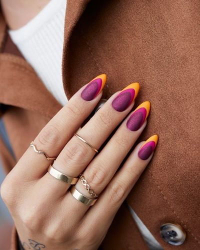 This daring combination of vivid purple and neon yellow speaks to the adventurous spirit of the season. The matte finish and almond shape make a bold statement, ideal for those who love to stand out. These nails work perfectly with a minimalist, modern outfit, allowing the colors to truly pop.