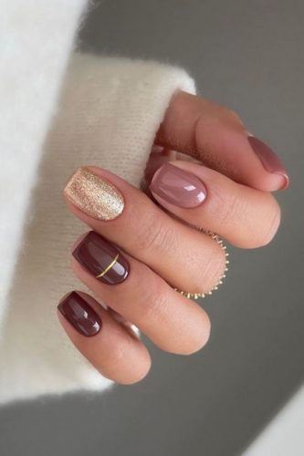 Match your nails to your favorite fall sweater with shades of mauve, ash, and gold. This design utilizes a matte finish on short, practical nails, making it a superb complement to your softest knitwear and golden jewelry, enhancing the warm, fuzzy feeling of a perfect autumn day indoors.