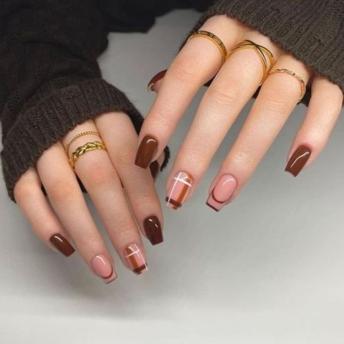 For a more subdued yet chic look, try these short nails in a deep chocolate brown, enhanced with minimalistic white lines. This design is all about understated elegance, suitable for both professional settings and casual days. Pair with a tailored leather jacket or a soft, oversized sweater to strike a balance between comfort and style.