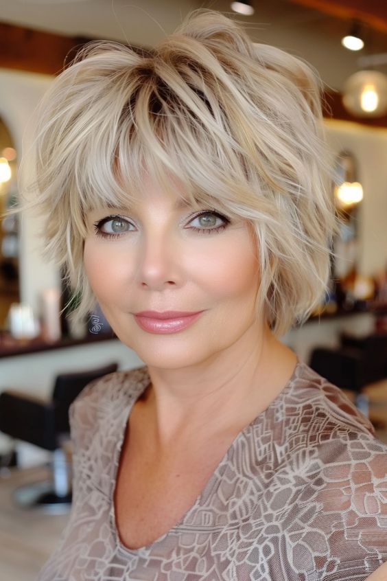 A soft layered choppy for mature women featuring blonde highlights. The layers add volume and movement, while the bangs frame the face elegantly, offering a sophisticated yet playful style ideal for all occasions.