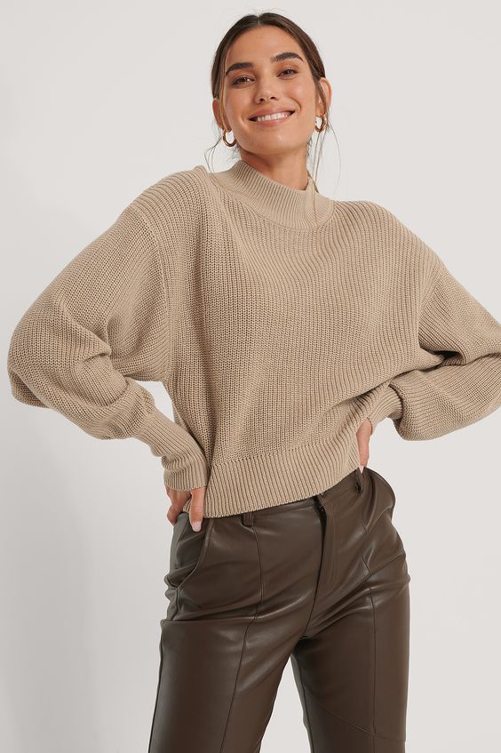 A beige knit sweater paired with brown leather pants creates a sophisticated and elegant look. The oversized fit of the sweater adds a cozy element, while the leather pants provide a modern edge. This outfit is perfect for a night out outfit classy or a chic daytime event. Accessorize with gold jewelry and ankle boots to complete the ensemble, ensuring you stay stylish and comfortable.