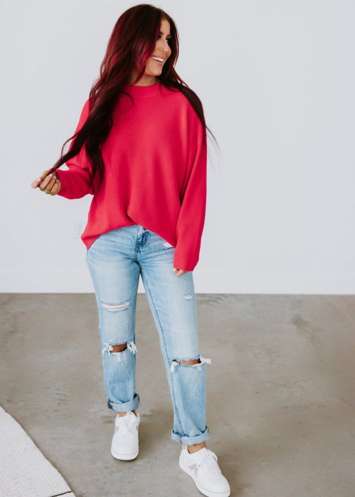 Add a splash of color to your fall wardrobe with this bright red sweater. Paired with distressed jeans and white sneakers, this outfit is perfect for a day out shopping or going to the movies. The vibrant red hue is eye-catching and fun, making it a great choice for those who love to stand out. This outfit is not only cute but also comfortable, ensuring you look stylish while staying cozy.
