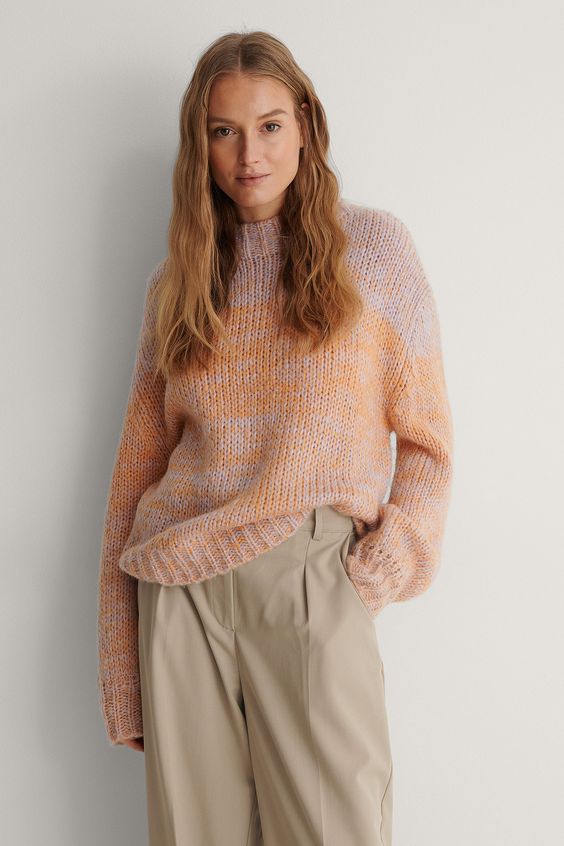 This outfit embraces soft neutrals, creating a subtle yet sophisticated look. The pastel peach and lavender sweater paired with beige trousers exude a calm and relaxed vibe. This ensemble is perfect for casual weekend outings or a relaxed day at the park. The loose fit and soft colors make it a comfortable choice for those who prefer understated elegance.
