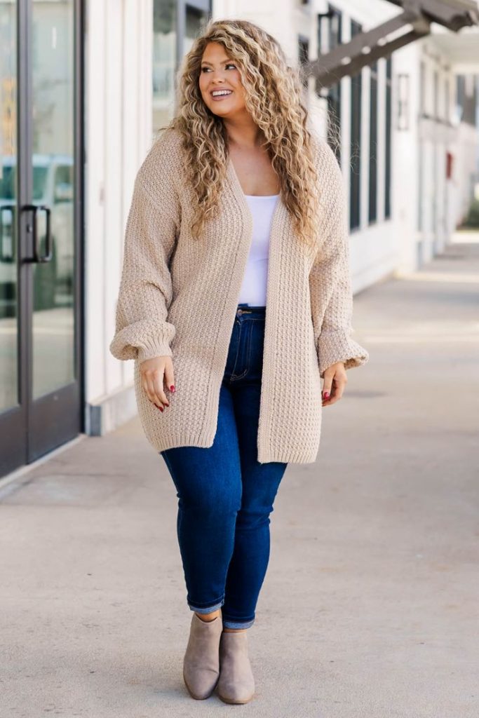 This look is perfect for plus size fashion lovers who want a cozy yet stylish option for fall. The chunky beige cardigan pairs beautifully with a simple white top and dark skinny jeans. Ankle boots complete the look, offering both comfort and style. The soft, neutral colors make this outfit versatile and easy to accessorize. It’s perfect for a casual day out or a laid-back evening with friends, providing warmth without compromising on style.