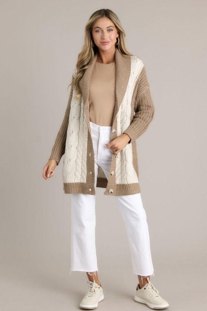 For a cozy and stylish fall look, this outfit features a mixed knit cardigan with beige and cream tones. Paired with white cropped jeans and a nude top, this outfit exudes a clean and elegant vibe. The neutral palette is perfect for layering with other colors, making it a versatile choice for various occasions. Whether you’re heading to an outdoor party or enjoying a casual day out, this outfit offers comfort and style.