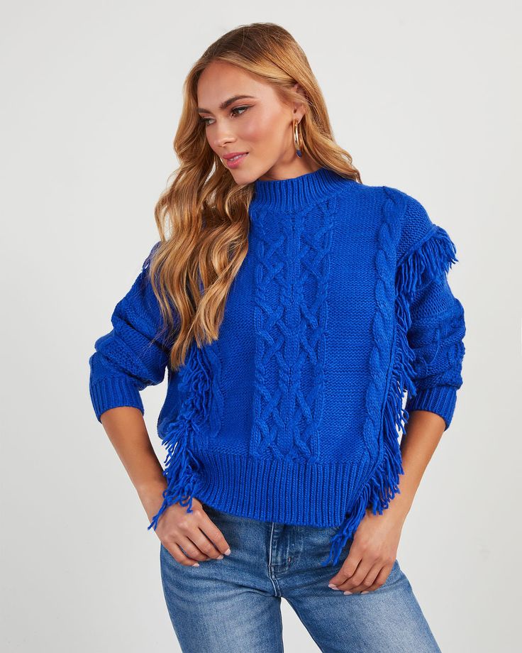 This vibrant blue knit sweater with fringe detailing brings a pop of color to any fall day. Paired with classic blue jeans, this look is both cozy and stylish. The intricate knit pattern and bold color make the sweater a standout piece, perfect for a casual day or an outdoor party. The simplicity of the jeans balances the look, making it easy to wear and accessorize. This outfit is great for adding a splash of color to the typically muted fall palette.