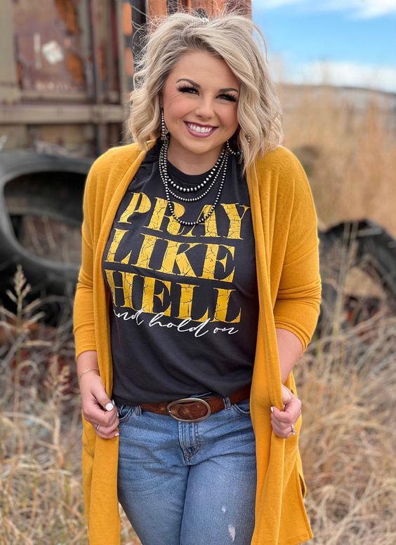 For those who prefer a bolder, more playful look, the next outfit features a mustard cardigan over a graphic tee with the phrase “Pray Like Hell and Hold On.” Paired with distressed casual jeans and accessorized with a statement necklace, this look is both comfortable and eye-catching. The mustard cardigan adds a pop of color, perfect for brightening up gray autumn days. This outfit is great for a casual chic style that can take you from a relaxed day out to a party night with friends.