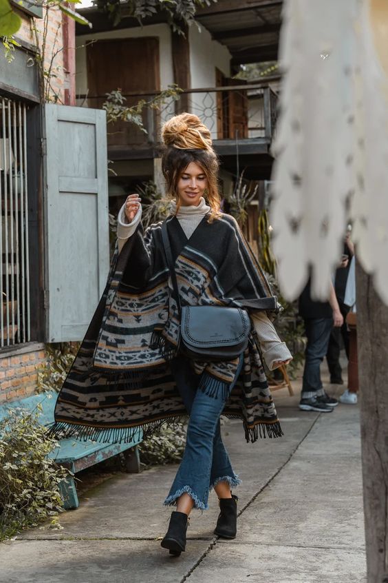 Bohemian styles continue to be a popular choice for fall, and this outfit showcases why. A patterned poncho with fringe details paired with distressed jeans creates a laid-back yet stylish look. The neutral tones in the poncho are complemented by the earthy brown accessories, including a slouchy bag and ankle boots. This ensemble is perfect for a preppy fall day or a hiking trip, offering comfort and freedom of movement. The boho-chic style is all about mixing textures and prints, making it easy to express your individuality.